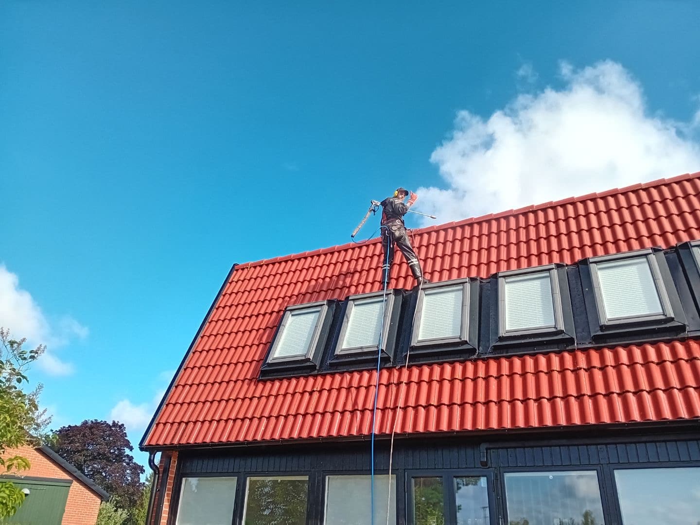 Vår process börjar med en grundlig besiktning där vi analyserar takets skick. Själva rengöringen genomförs med en högtryckstvätt i kombination med specialdesignade munstycken och en taksläde som ger en jämn och skonsam rengöring. Denna metod tar effektivt bort smuts, alger och mossa utan att skada takpannorna. Vi anpassar trycket utifrån taktypen för att säkerställa att ingen ytförstöring sker.